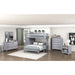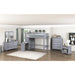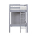 Maximize your child's bedroom space with this multifunctional gray loft bunk bed, designed for both style and practicality. Crafted from wood with a sleek gray finish, this bunk bed features a top twin bunk with guard rails for safety and a full-size lower bed. The built-in storage unit includes seven dovetail drawers with smooth ball-bearing glides for organized storage, and a hidden desk on casters that easily rolls out for study or creative activities. Polished nickel-tone flush ring pulls add a touch of sophistication, and the design eliminates the need for a foundation or box spring, making it a space-saving and efficient choice for any bedroom.
