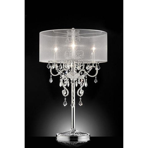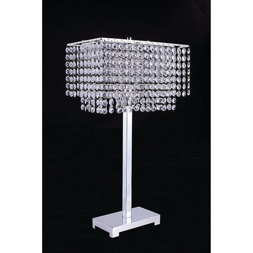 Perla Chrome Table Lamp, 15"L X 15"W X 28"H, 4.22lbs. This 19-inch tall table lamp features diamond-cut faux crystals and a stable, chrome base. Fe...