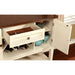 This gorgeous dining table features a rich cherry wood finish table top and molded trim, resting upon sturdy black tapered legs. The side chairs showcase contoured wood seats and slatted backs.